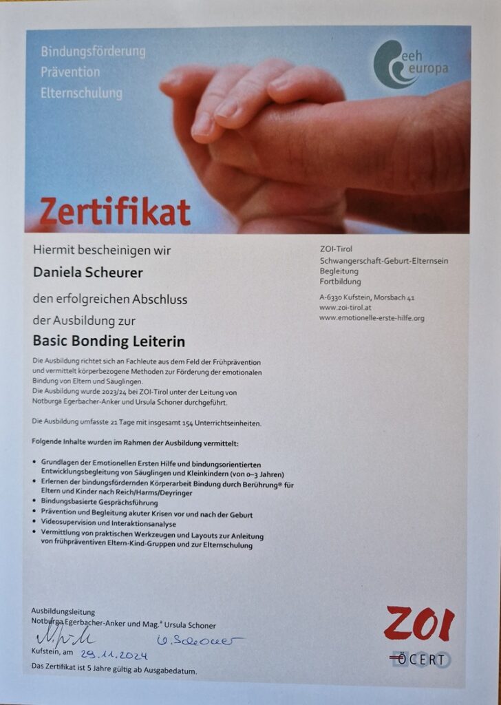 Im November 2024 habe ich erfolgreich die Ausbildung zur EEH-Basic Bonding Leiterin abgeschlossen und starte gleich ohne Umschweife damit, mein neues Wissen über einen starken Bindungsaufbau weiter zu geben. Weil ich Neuanfänge, Geburten so sehr liebe, ihre Magie, ihren Glitzer und das schaurigschöne Gefühl, sich dabei aus seiner Komfortzone zu bewegen.